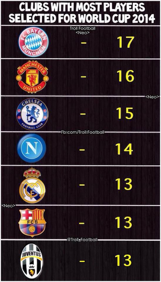 Clubs With most players Selected For World Cup 2014
